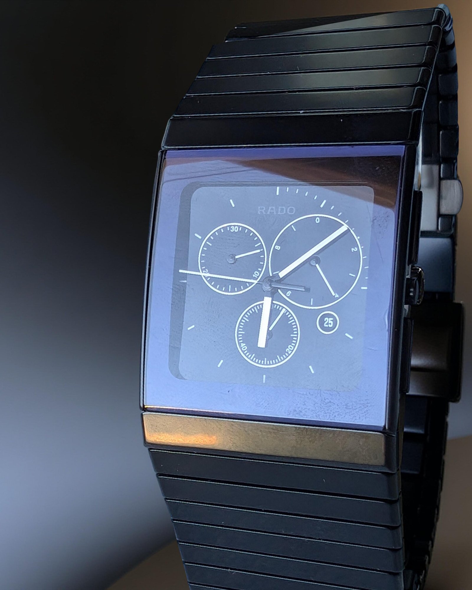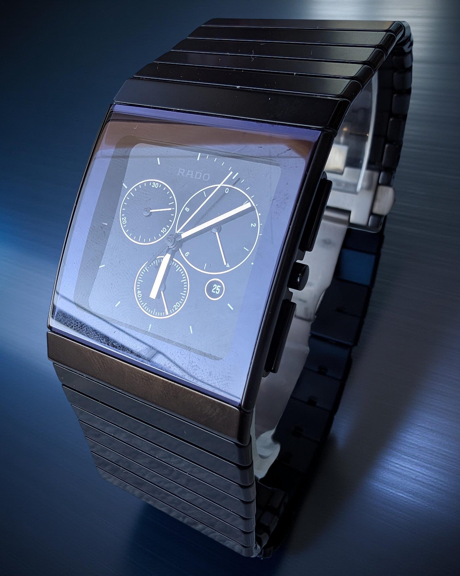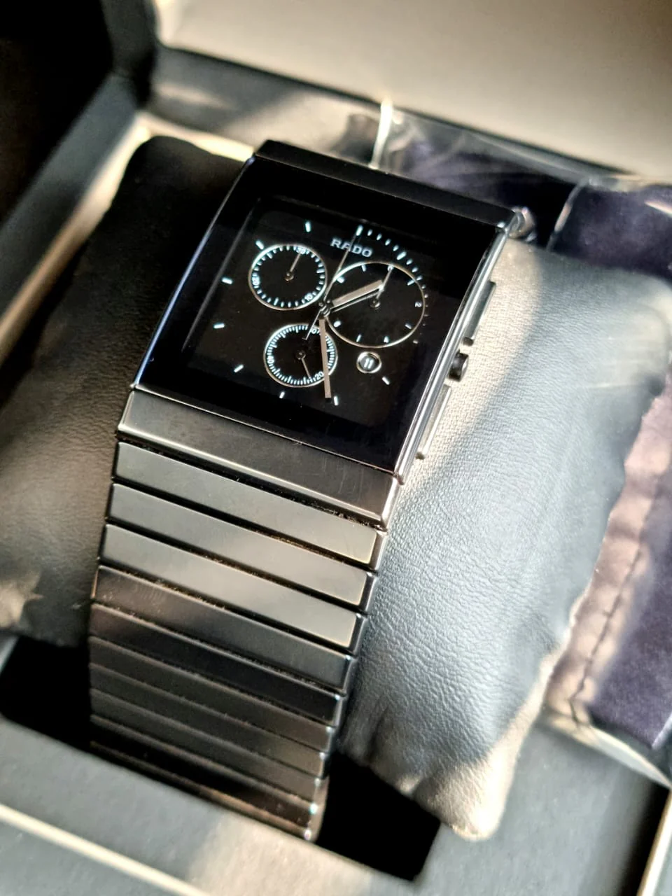 This watch has barely been worn and is in excellent aesthetic and mechanical condition. The flat, modern, and minimalist rectangular design makes this piece highly sought-after, especially in the XL chronograph version. Suitable for both everyday wear and formal occasions.